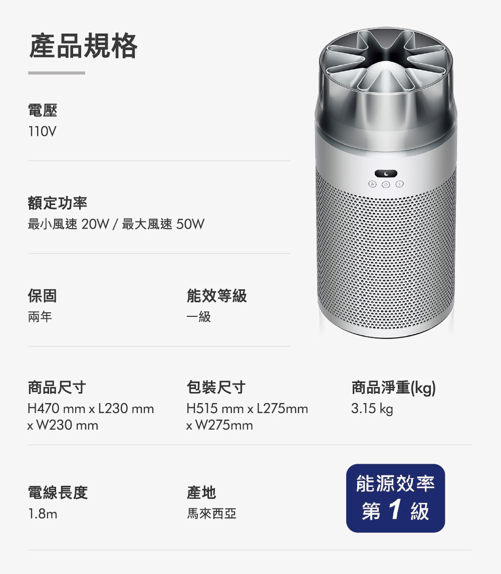 恆隆行全機保固:風扇/空氣清淨機保固2年(非營業用) 如需維修或保固問題,請於平日週一至週五上班時間9:00至17:30撥打客服專線:0800-251-209 以下情況不在保固範圍內: -使用在非正常居家場所 -使用及保養疏忽、濫用、疏忽、粗心操作,造成的損壞與故障 -在碎石、灰渣、灰泥的環境下使用本產品 -自行安裝錯誤 -進行維修或改裝在非戴森授權代理的單位 -使用非戴森原廠零件與配件 -未依使用說明手冊組裝或安裝的零件 -人為意外造成的損壞與故障 -使用延長線因超載而導致電線過熱或著火