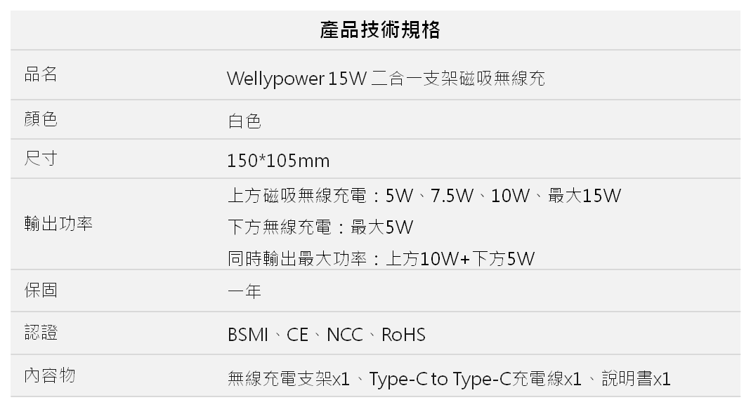 - 提供最高 15W 輸出功率,建議搭配Wellypower 30W以上的快充充電器,達到最佳充電效率。