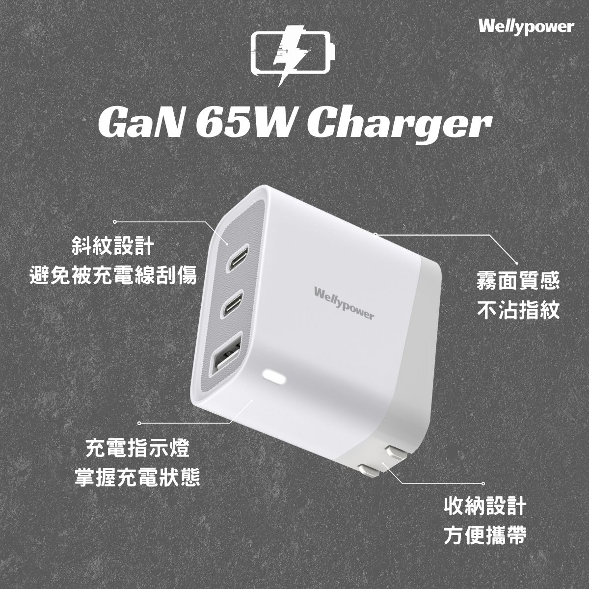 【Wellypower】GaN氮化鎵 65W 三孔快速充電器 (客製化刻字)